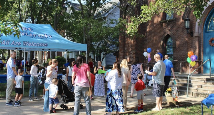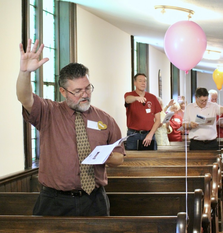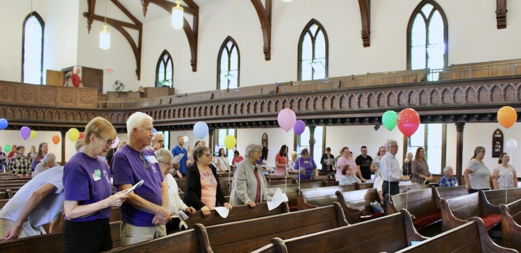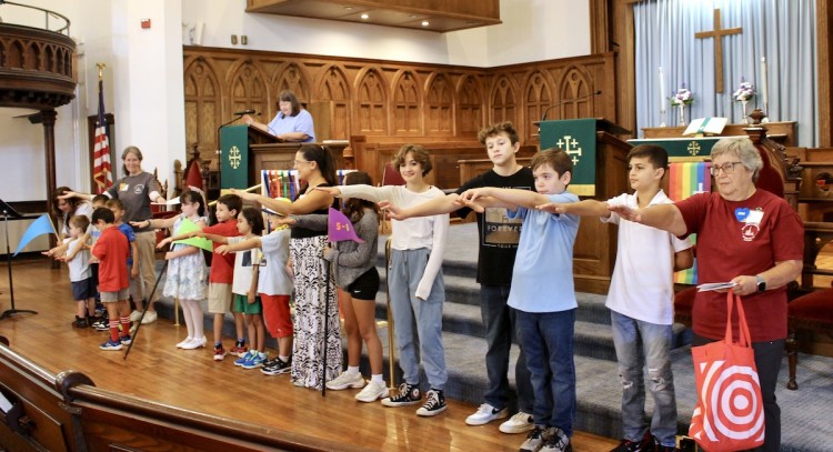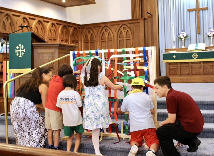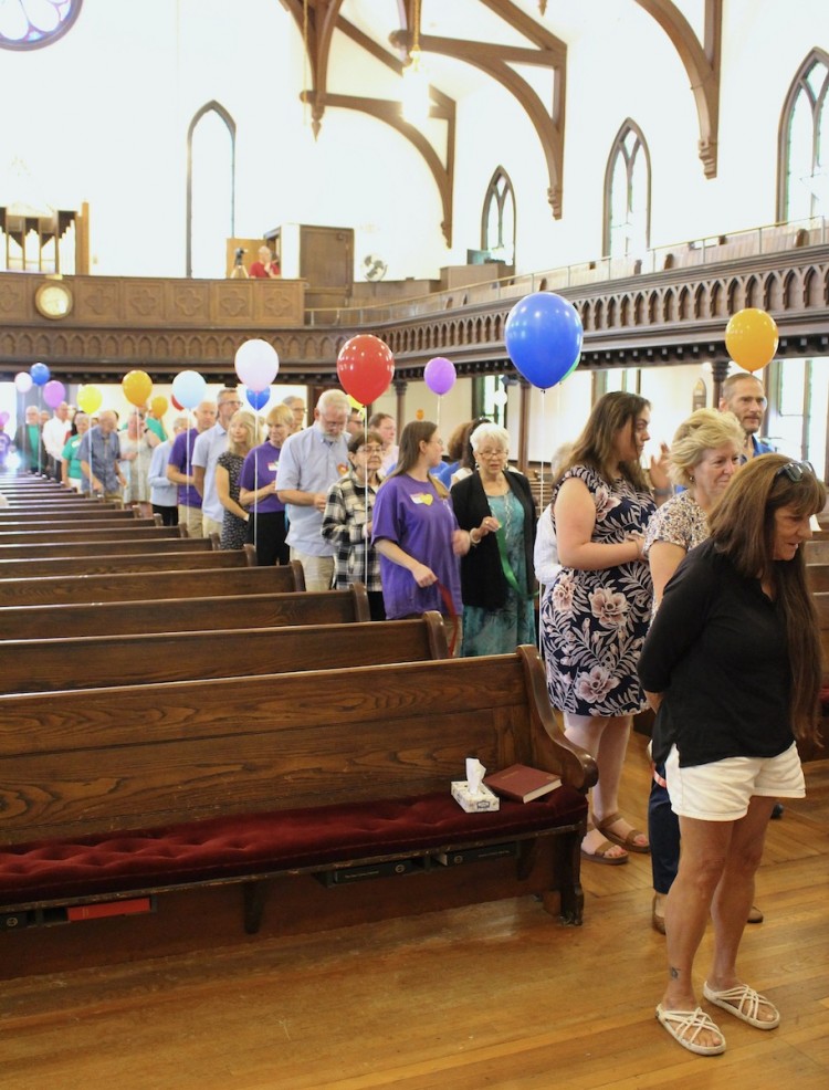 The Church School kids and their teachers gathered outside before the traditional procession, while others worked to decorate the sanctuary with brightly colored balloons and prepare for the picnic to follow worship.